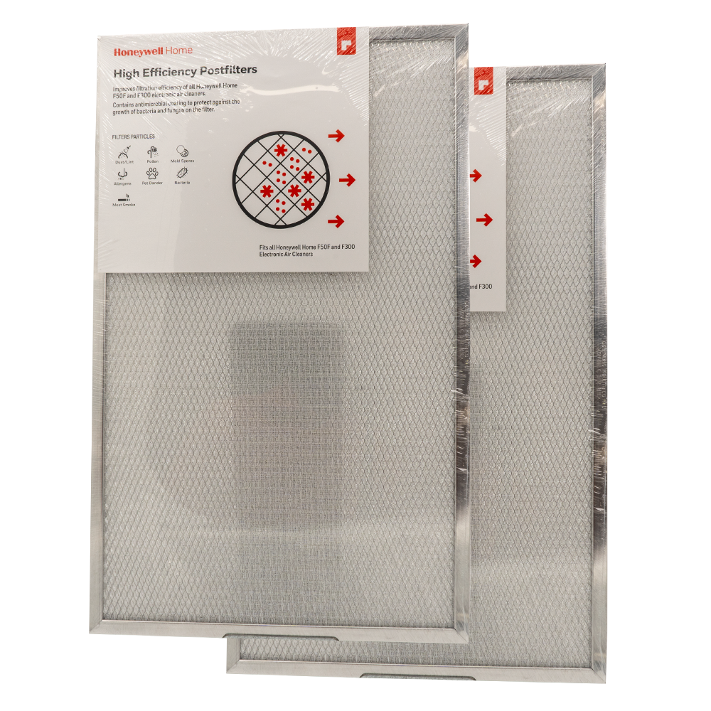 Honeywell 50000293-004 replacement postfilters for Honeywell Electronic Air Cleaner. 20"x25" This Pack Contains Two 20"x12.5" Filters to Fit a combined 20"x25" Air Cleaner. OEM replacement for Honeywell Electronic Air Cleaner. (50000293-004) Features: New postfilters have been proven to add 8-10 percent more efficient at the smallest micron channel (0.3-1 microns), while keeping added pressure drop at a minimum. Antimicrobial coating protects against bacteria and fungal growth on the postfilters. Electrostatic charge helps attracts airborne particles like a magnet. Note:The electrostatic charge will break up if washed. Postfilters will elevate the performance of your air cleaner's efficiency in capturing bacteria, smoke, particles, mold spores and other fungi. Replacement filters for F300 and F50F Electronic Air Cleaners only - will not Fit F50E models. Honeywell recommends that postfilters be replaced approximately every six (6) months.