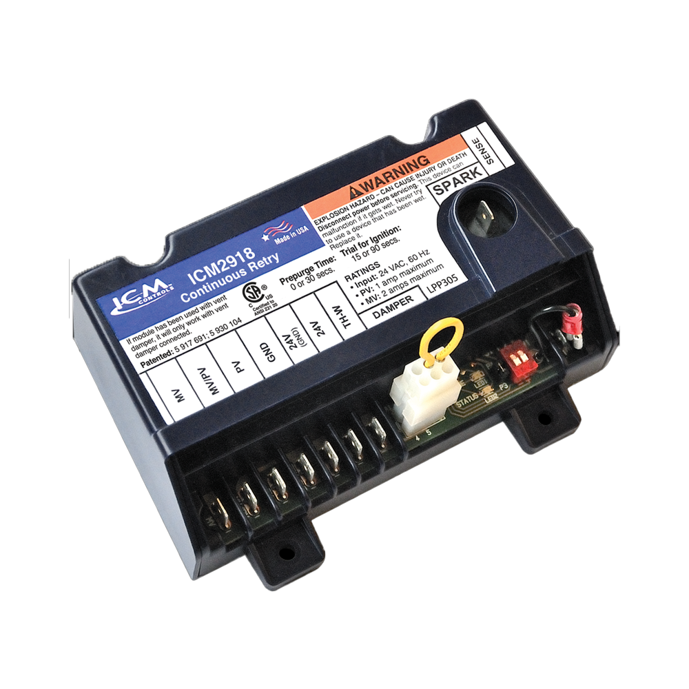 The ICM2918 Universal Intermittent Pilot Gas Ignition Control Module is a field service replacement for many popular flame rectification type of intermittent pilot ignition (IPI) modules. Provides electronic control for most intermittent pilot ignition systems used on gas-fired furnaces, boilers, and other heating appliances.
