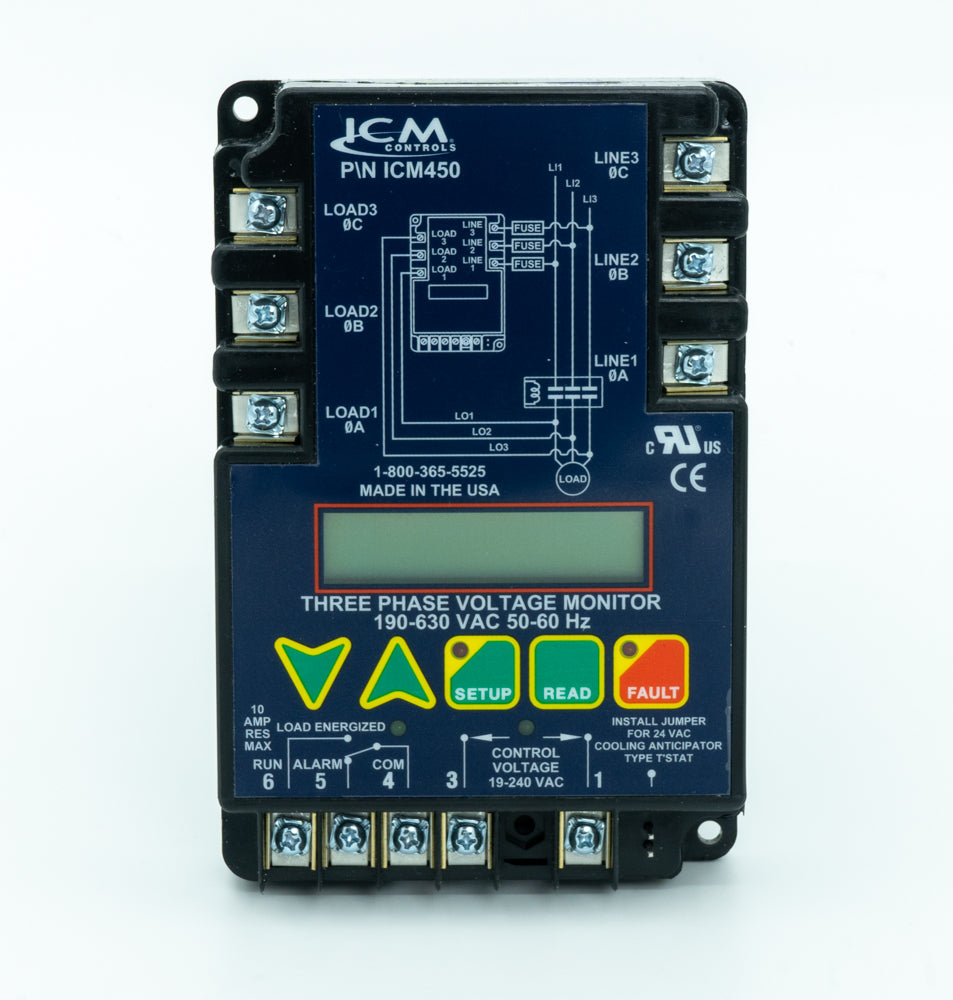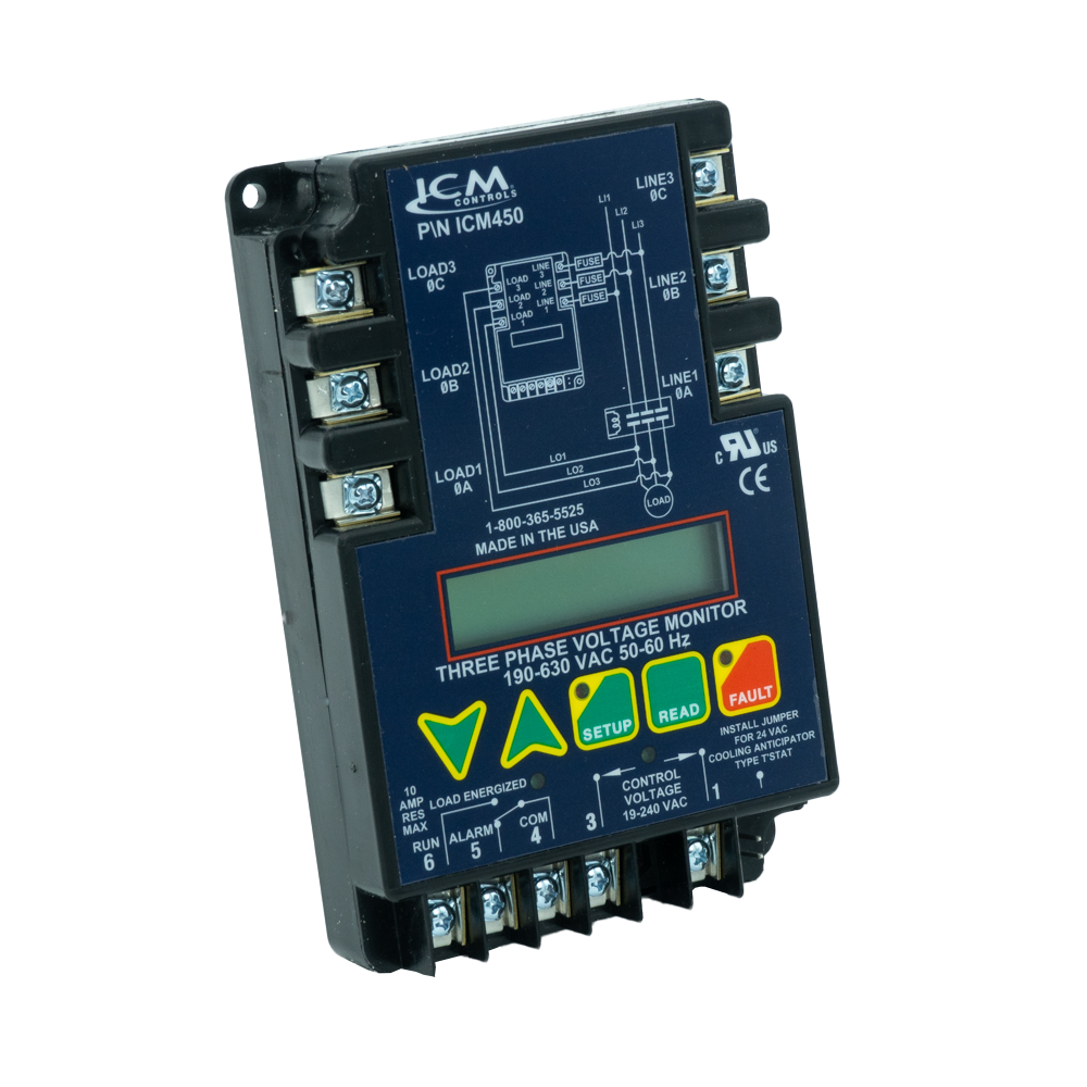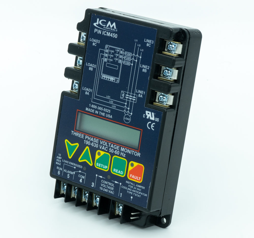 The ICM450A was specifically designed to protect motors and other 3-phase loads from premature failure and damage due to common voltage faults such as voltage unbalance, over/under voltage, phase loss, reversal, incorrect sequencing and rapid short cycling.